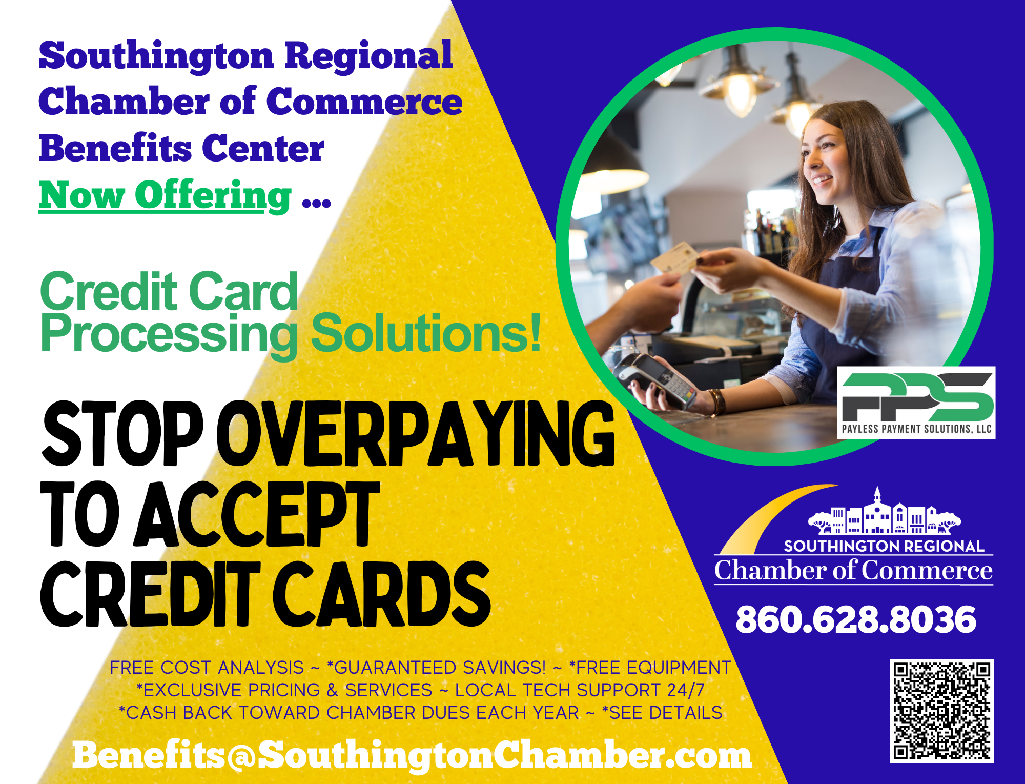 Through a unique partnership with PPS – Payless Payment Solutions, LLC, Southington Chamber member businesses can save money on processing credit cards. We start with a free cost and no obligation analysis of your current processing or assess your needs if you are just starting out. Before your PPS – Payless Payment Solutions, LLC credit card processing is activated business must show proof of Chamber membership.