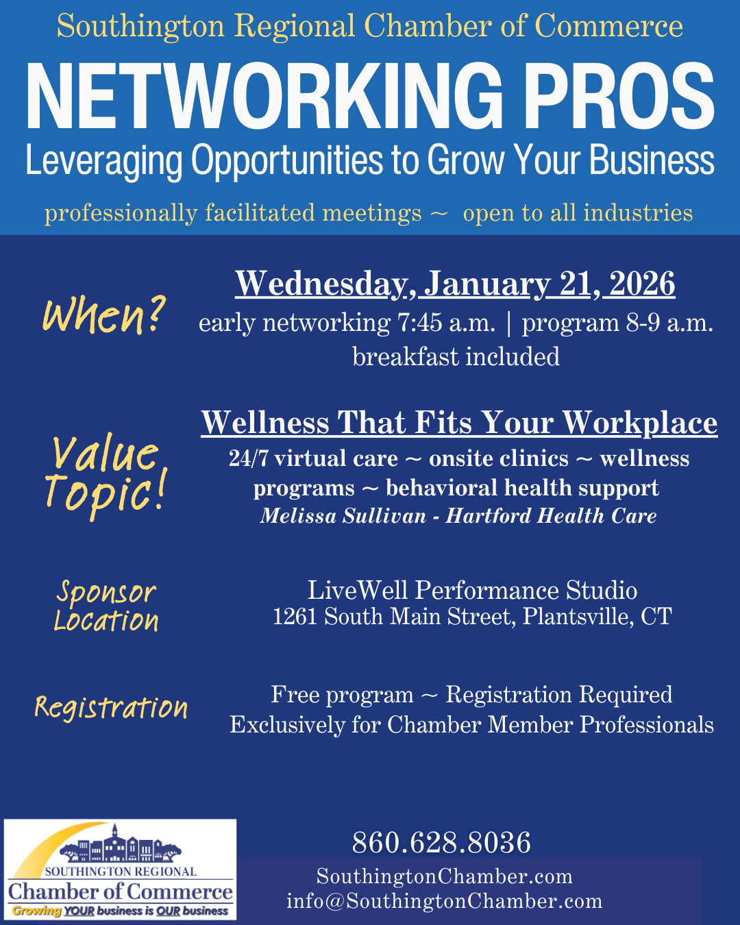 Wednesday, January 21, 2026, 7:45 AM - 9 AM, LiveWell Performance Room, 1261 S Main St, Plantsville: Note: This is a Chamber Member exclusive event. All employees of Chamber Member businesses are welcome to attend. Non-Members may contact the office at (860) 628-8036 to complete an application.