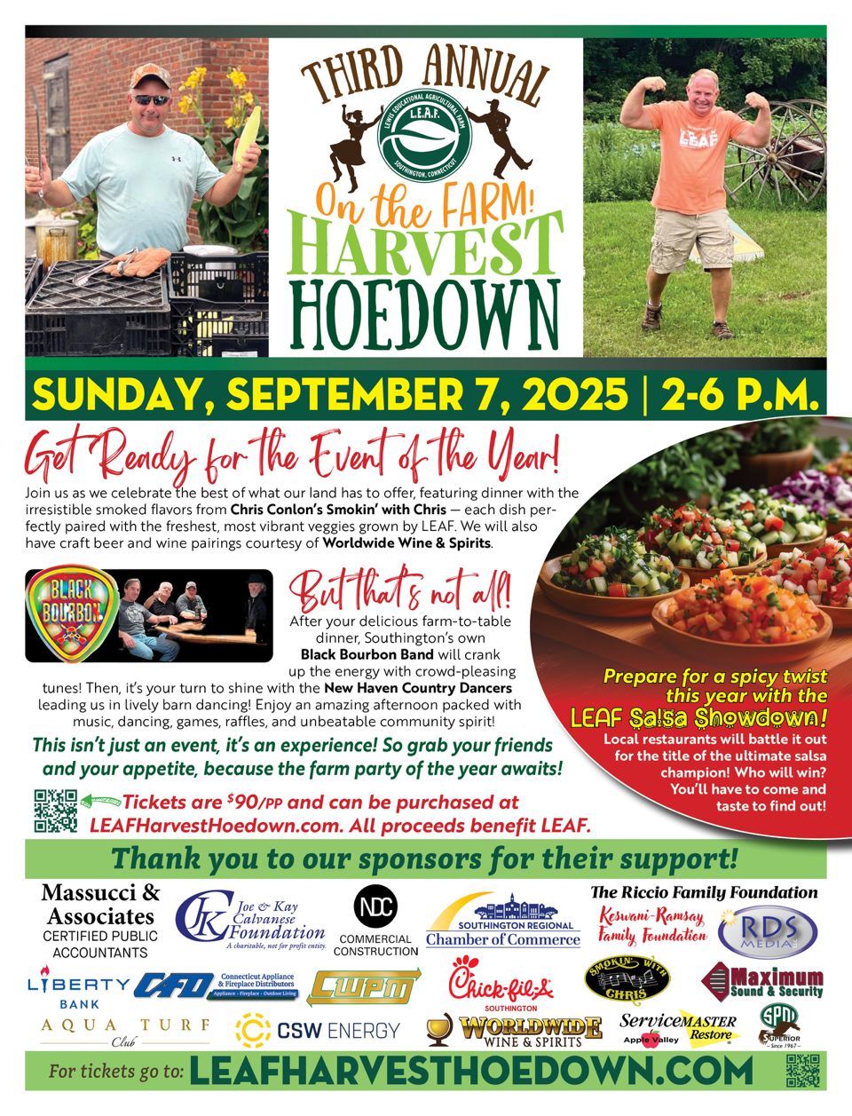 The Southington Regional Chamber of Commerce is proud to be a Platinum Sponsor in partnership with L.E.A.F. for their Third Annual HARVEST HOEDOWN on the Farm!